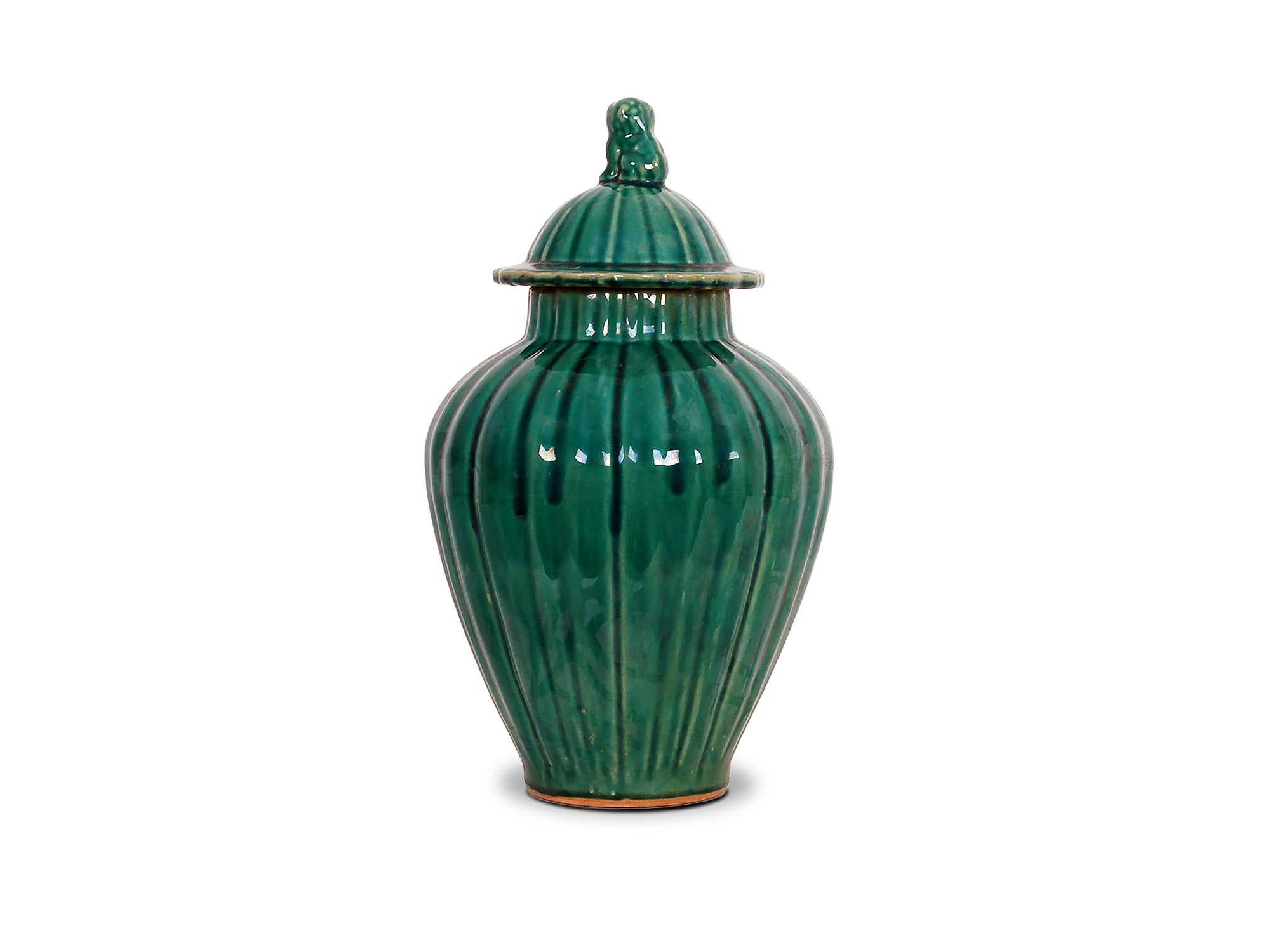 Reproduction carved fluted jar with a washed green glaze finish. Handmade and hand decorated. Photo is for reference. Final product may vary and feature imperfections that provide more character.  Measurements are approximate. Size: 8" Dia x 18" HRead more