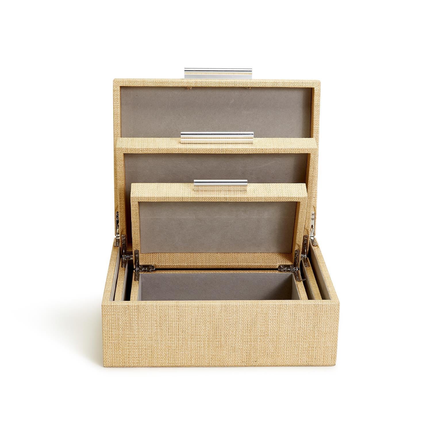 Bring the natural vibes into your home with these set of 3 terra cane nesting decorative boxes. Features a nice clean polyester interior, hinges on the side for easy opening and closing and a shiny metal handle. Assorted...Read more