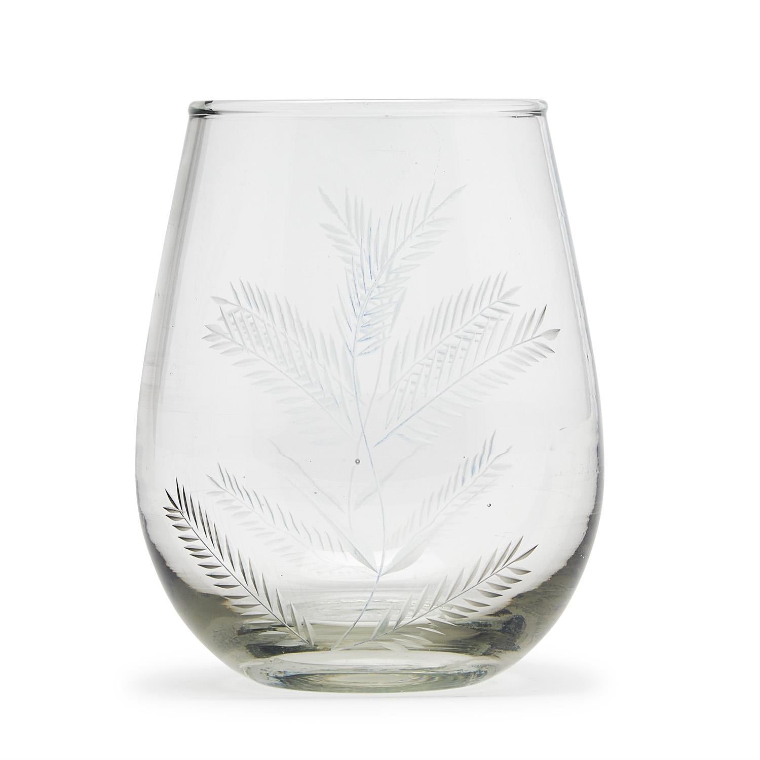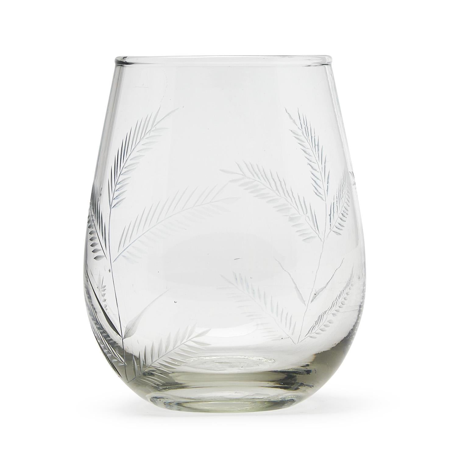 Pour up your favorite wine in these beautifully fern detailed stemless wine glasses. These glasses will bring a chic touch to your favorite barware assortment.